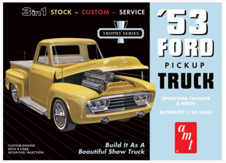 The Kats at AMT have done it again, this time with the Trophy Series 1953 Ford Pickup! It's been BACKDATED TO ITS ORIGINAL 3 IN 1, FIRST ISSUE FORMAT, complete with retro custom wheels, two motors and a wealth of parts for any builder to create a truly unique model!