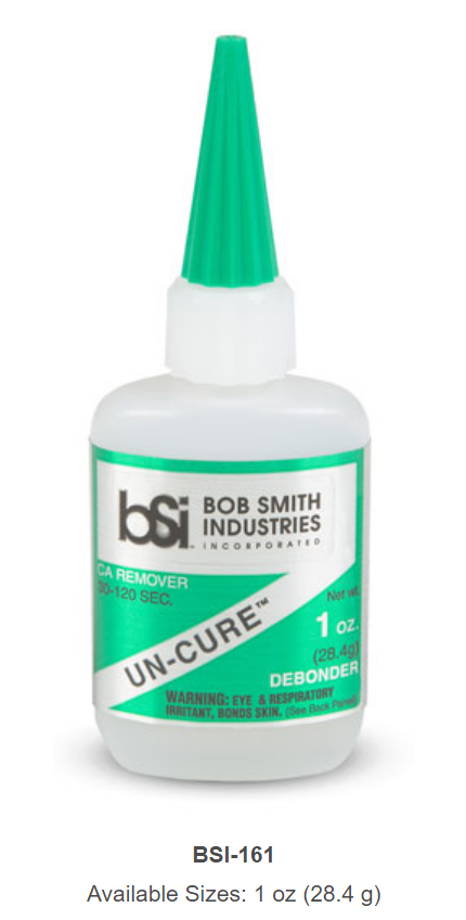 UN-CURE debonder will soften cured CA. If parts are bonded incorrectly or your fingers are stuck together, a few drops of UN-CURE will dissolve the CA in about a minute. Apply on bonded skin and roll apart fingers. Once stuck, use acetone to clean off softened CA, then wash off with soap and water. Since cured CA is essentially acrylic plastic, anything that will dissolve CA will also soften most plastics. Care must be used, therefore, when using Un-Cure on plastics. Separating plastics parts with a razor saw is usually the best option.