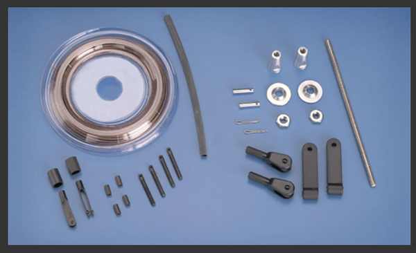 #883: For large scale aircraft - .91 and larger. Comes complete with high quality aluminum horns, washers, steel 8-32 long shaft, nuts, horn arms, and kwik-links for 4-40 rods and 15ft. of nylon coated stranded steel cable - .032 dia. and all mounting hardware. 2/pkg.