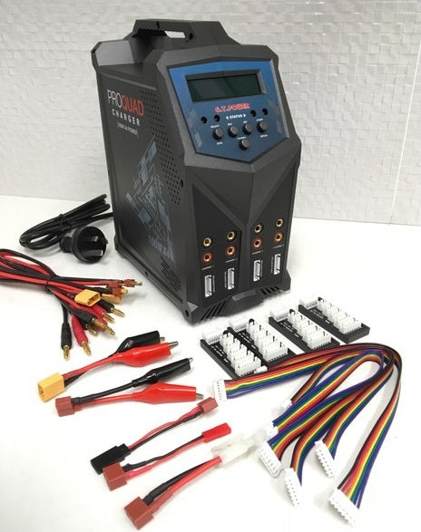 The G.T. Power X4 Pro Quad charger is a simple yet powerful quad output (4x 100W) dual input multifunctional charger with built in LiPo balancing (JST-XH) for up to 6S Lithium batteries.