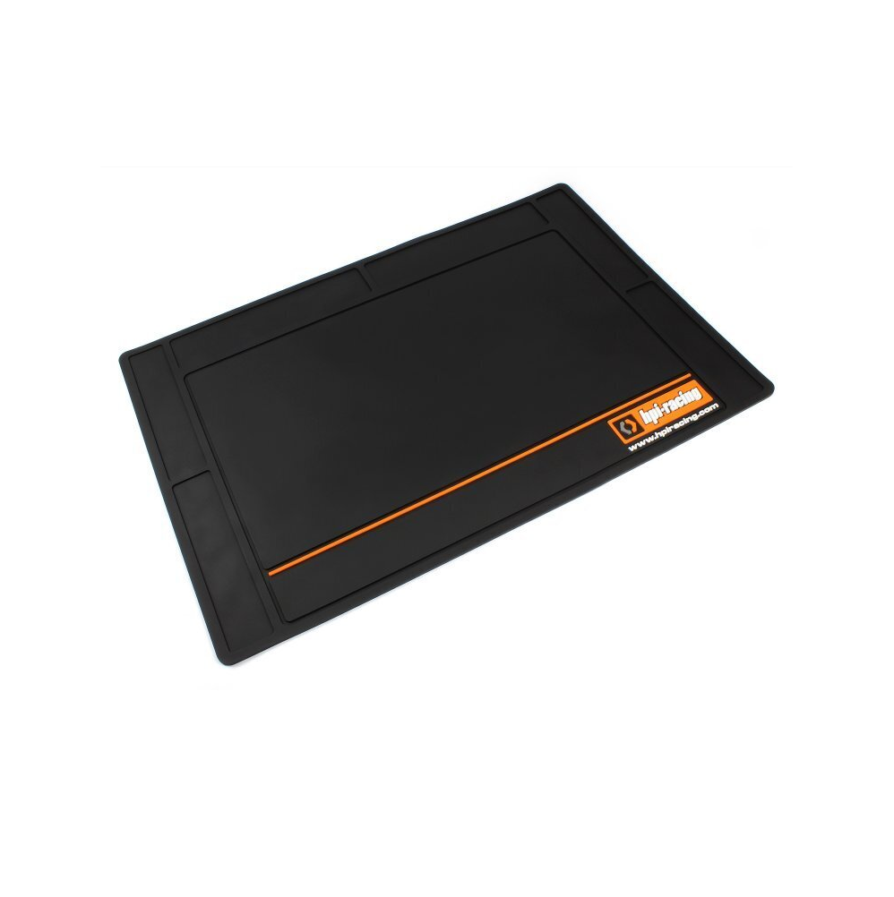 HPI racing pit mat is manufactured from solid black rubber with recessed panels down each side and across the top to hold bits and pieces.