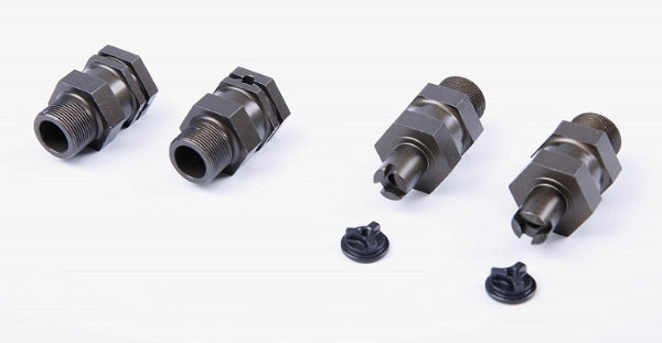 Optional wheel hub extender kit in gunmetal aluminium. This kit widens the track by 1 inch (1/2 inch per wheel, front and rear) and supplies clipless front mounted hex hubs.