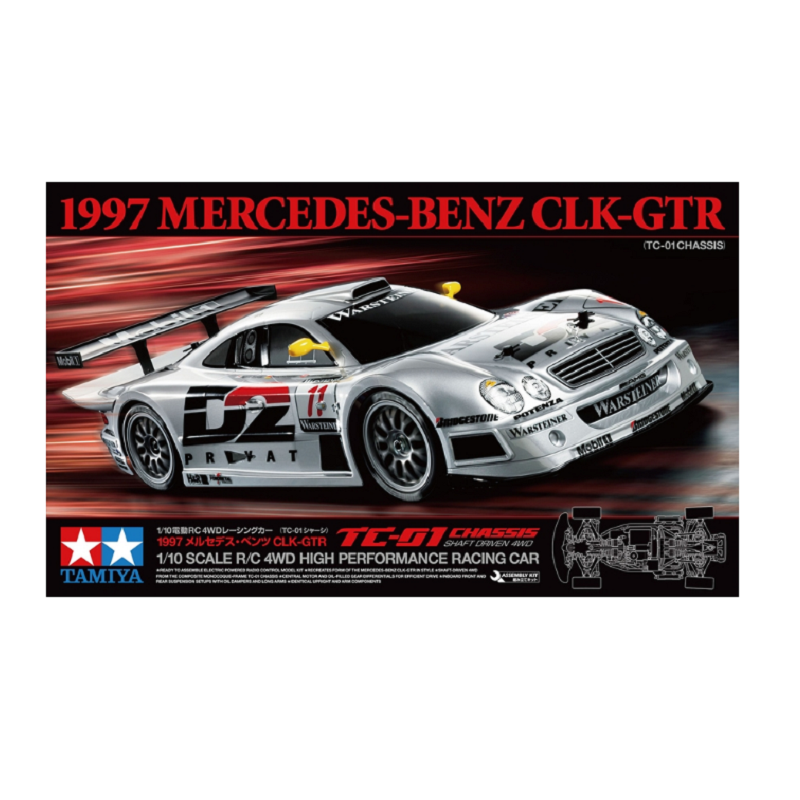 The Mercedes-Benz CLK-GTR R/C car kit first made its appearance in the Tamiya product catalog in 1998 on the popular TA-03R chassis platform then later the easy to assemble TT-01E platform. The CLK-GTR has made a return this time on our high-performance TC-01 chassis platform, which is destined to provide the most performance yet as it takes advantage of the Mercedes sleek body profile and the low center of gravity of the TC-01!