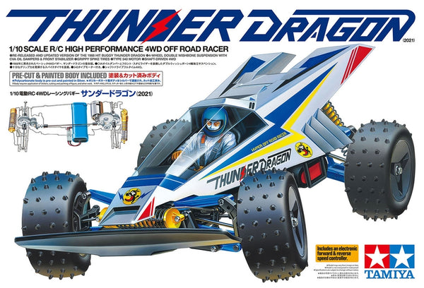 This is a re-issue of the classic Thunder Dragon buggy originally released in 1988. The classic buggy utilizes shaft-driven 4WD and smooth, ground hugging suspension providing a super-fun driving experience. The stylish Thunder Dragon body which appeared in a classic R/C comic in Japan, is an exciting re-release for R/C fans of all ages and abilities.