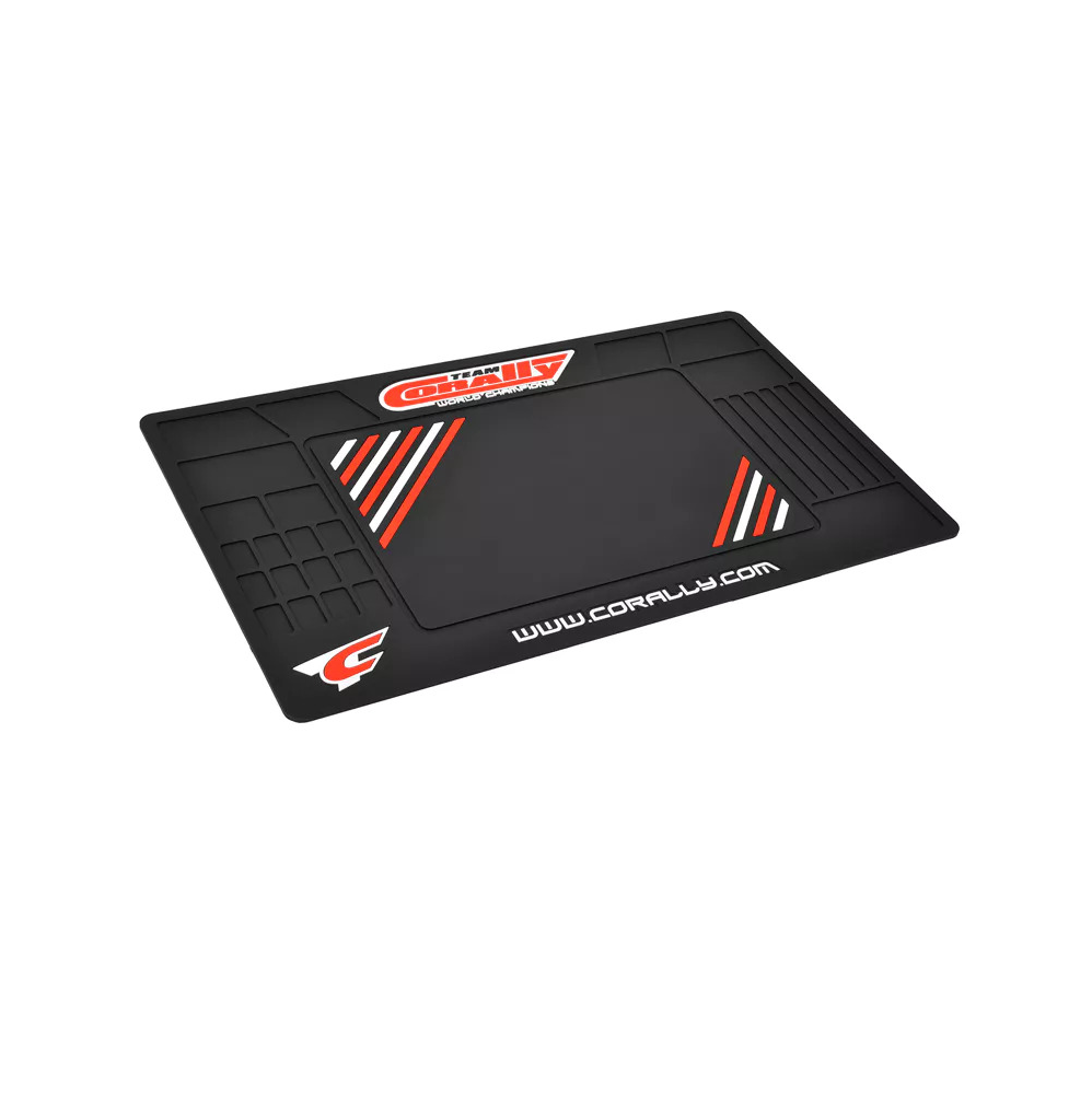 Team Corally racing pit mat is manufactured from solid black rubber with recessed panels down each side and across the top to hold your bits and pieces and tools.